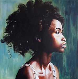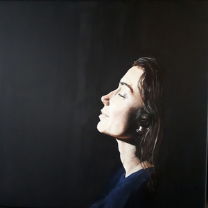 2021Een uitprobeersel... het portret is geschilderd op verbandgaas, wat ik vooraf op het canvas doek heb gefixeerd. Dit geeft een bijzondere structuur aan het werk en meer diepte.